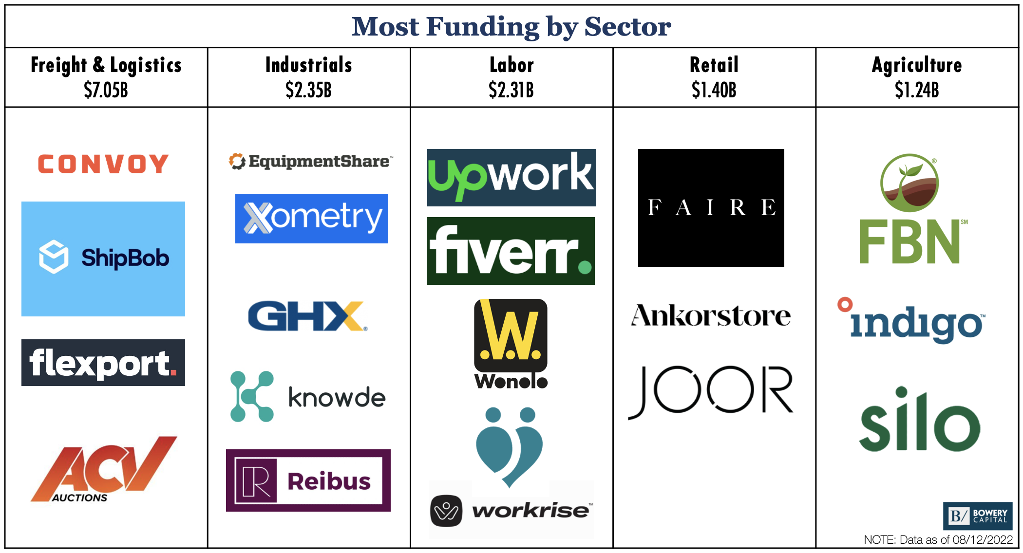 Of the nearly 100 B2B marketplaces we tracked, these verticals have raised the most capital. The following numbers reflect the total funding of each sector’s constituent companies (from founding till date).