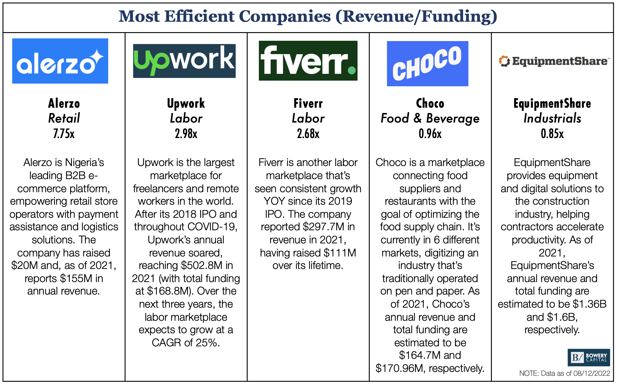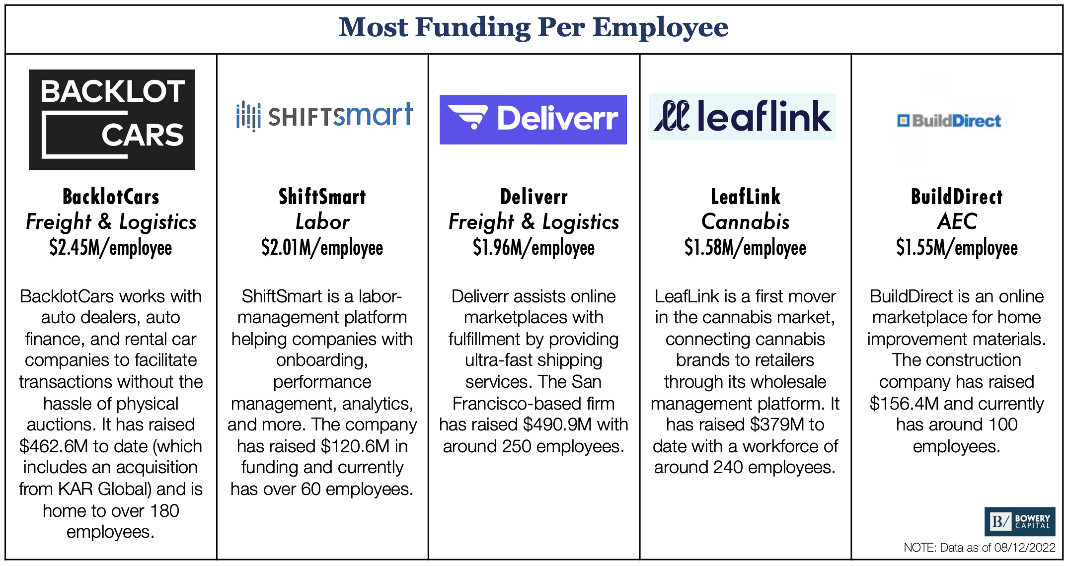 We also looked at firms with the most efficient employee base relative to funding. Notably, four of the 10 companies with the most efficient employee base belong to the freight and logistics vertical.
