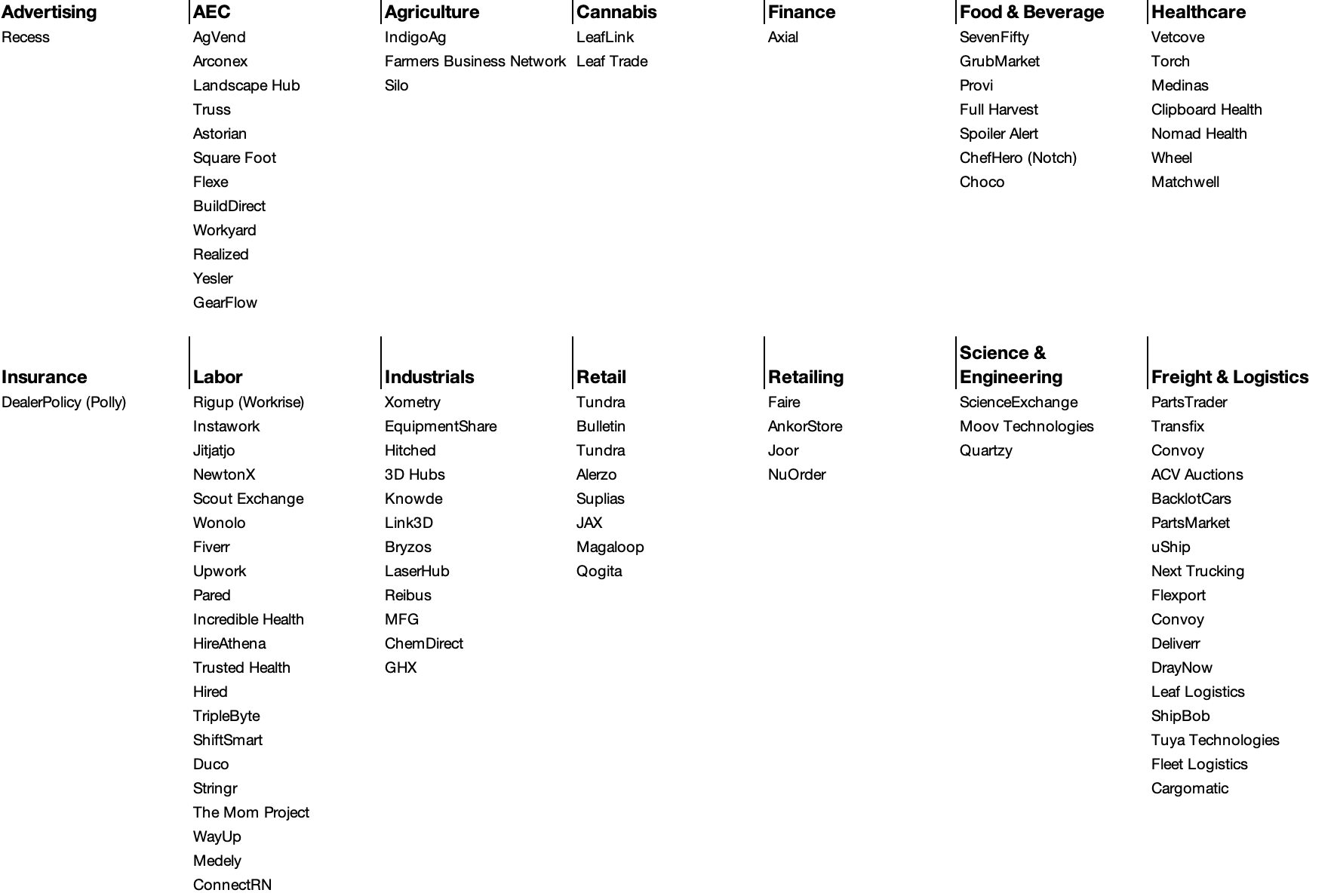 In 2020, we released a field guide to B2B marketplaces that included conversations with founders and investors as well as takeaways regarding historical companies in the space. As a continuation of our content series focused on the future of B2B marketplaces, we conducted further analysis of roughly 100 companies spanning 14 distinct industries. Our goal with this project is to highlight current trends in the marketplace investing landscape and drive discourse around the themes in our portfolio. Below are some key takeaways from our research: