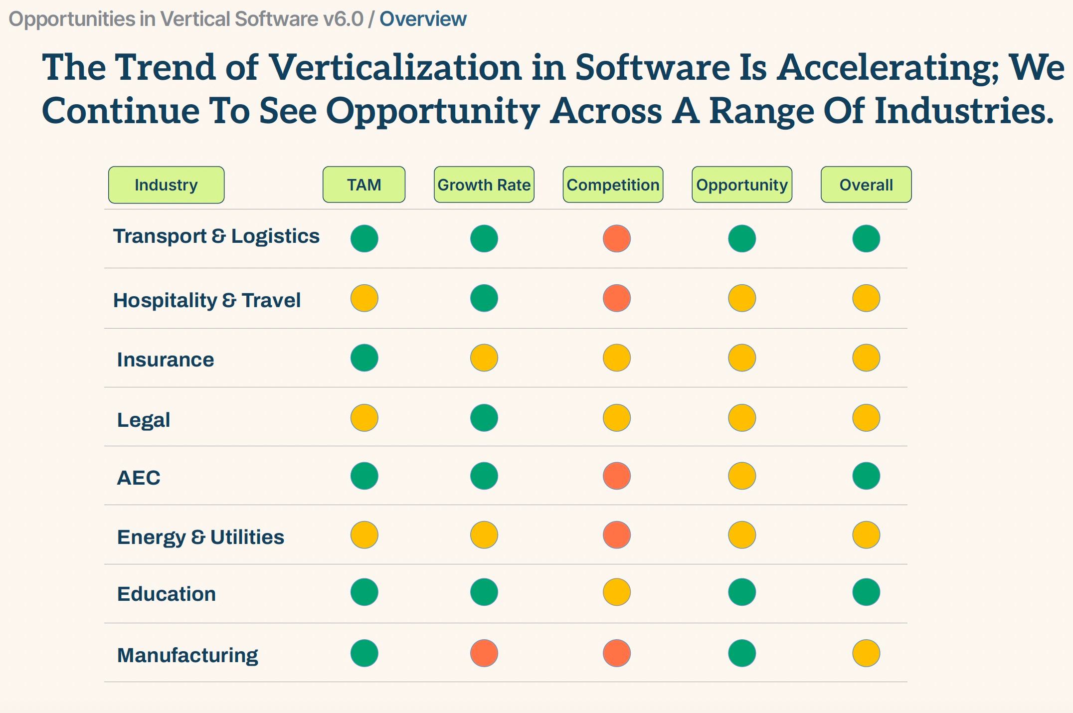 We are pleased to present the 6th edition of our Opportunities in Vertical Software report. The first edition of this report was published in 2014 and every two years we like to do a refresh to track how the vertical software landscape is changing. Vertical software has become one of the hotter investment categories since our last edition in 2022 with AI driving a surge of VC interest in the business model. As longtime vertical software investors, we like to use this report to share our views on various industries and to survey category-specific software spend, funding activity in different verticals, leading VC firms in each vertical, and much more.