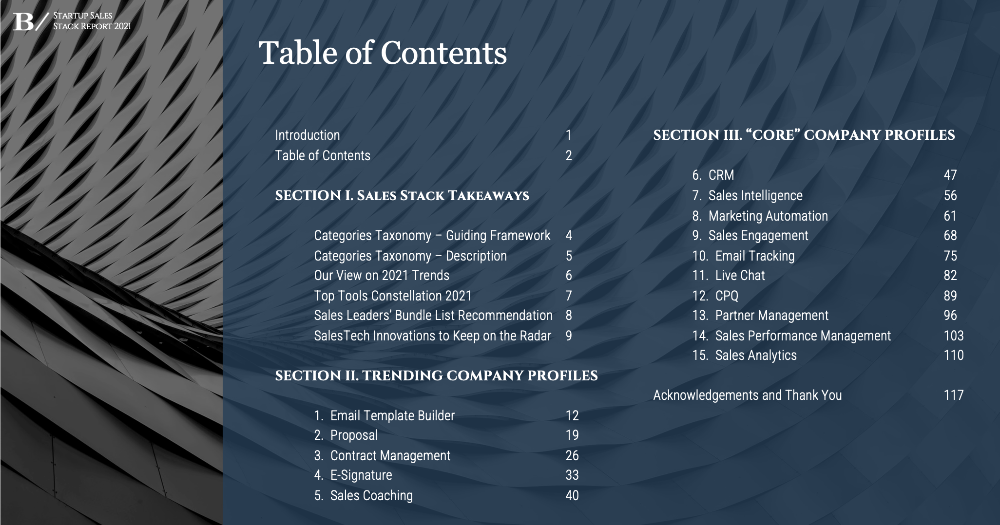 It’s important to note here that the list of tools in this Sales Stack Report isn’t exhaustive; we had to leave out some great solutions that are also worth considering. Though we worked hard to cover the full landscape, the truth is that each of these 15 categories could probably be expanded into a 100-page guide in its own right. But we believe this year’s 2021 update of the Startup Sales Stack Report will provide a great starting point for any early-stage founder, salesperson or startup stakeholder looking to take their sales infrastructure to the next level. Lastly, we welcome any feedback or suggestions for the next go-around. Feel we misrepresented a product feature or pricing structure? Are we missing your favorite tool or startup? We would greatly appreciate if you could please submit all of your comments and feedback directly via LinkedIn, Twitter, or Email so that we can use them to improve the report for future years. Thanks and we hope you enjoy!